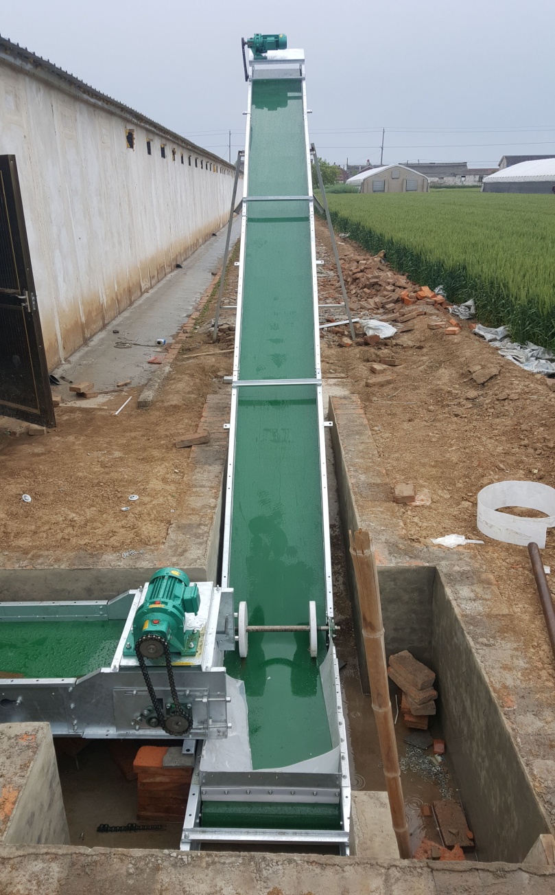淸粪带厚度达10mm,耐酸碱,可做坡度设计,输送鸡粪,节省劳力。